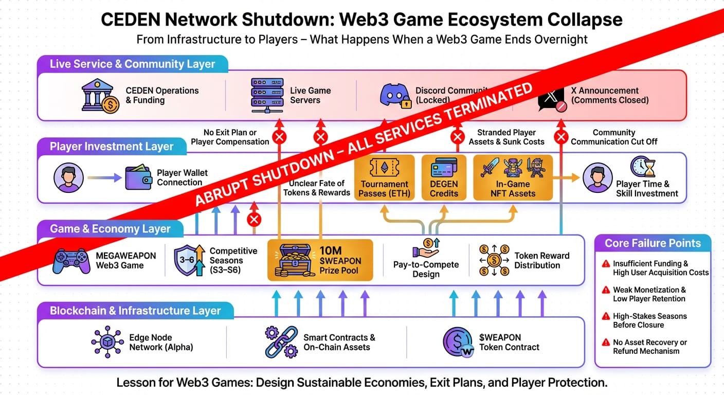 In summary, CEDEN Network’s shutdown and MEGAWEAPON’s end reveal key learning values in GameFi: robust tokenomics require balanced emissions, effective sinks, and adaptability to market shifts. Strengths in the project’s design included innovative NFT integration for ownership, fostering community-driven battles that could have scaled with better economic guardrails. However, structural risks—such as overinflation, dependency on hype-driven inflows, and vulnerability to sector downturns—proved fatal, aligning with 2025’s investment reset and 2026’s emphasis on sustainable models like those in Tapzi or privacy tokens.
